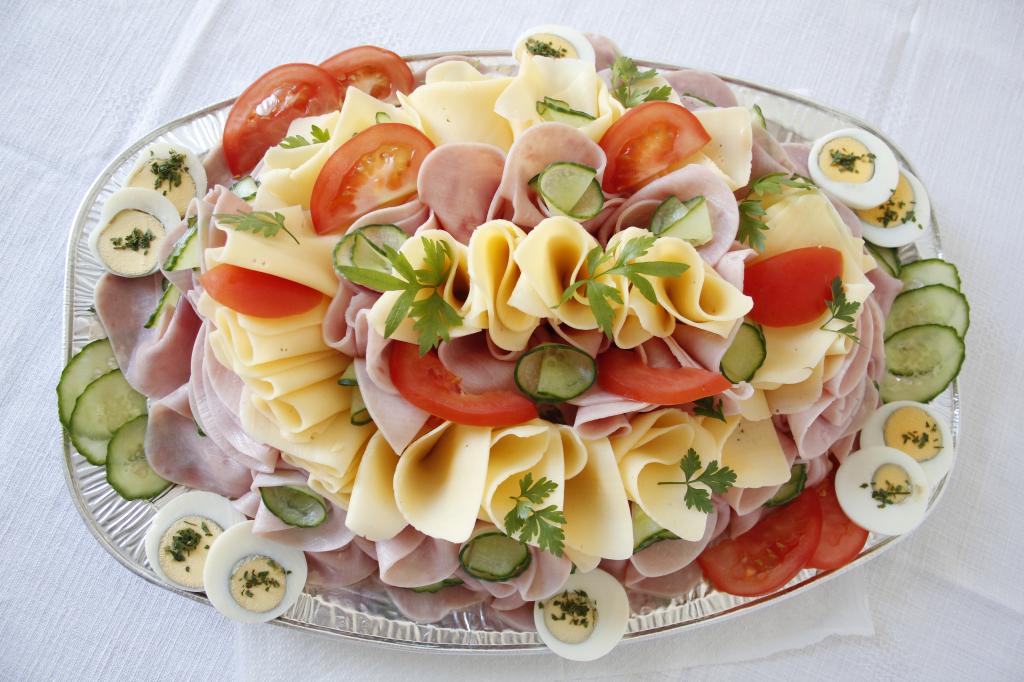 Šunka, eidam, zemiakový šalát, obloha so sterilizovanej zeleniny, vajce