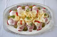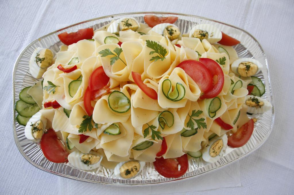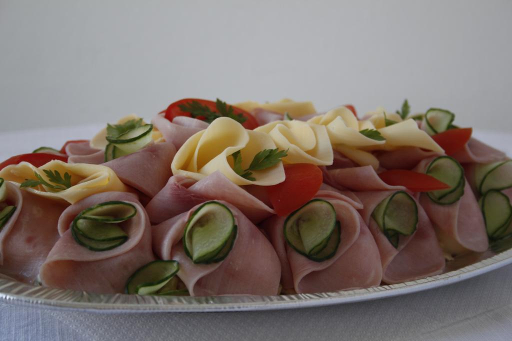 Parížský šalát, šunka, šunková saláma, suchá saláma, eidam, vajce,obloha so sterilizovanej zeleniny