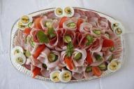 Šunka, šunková saláma, suchá saláma (2 druhy), eidam, kapia, obloha so sterilizovanej zeleniny, vajce