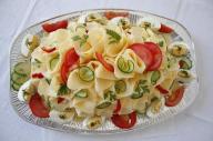 Zemiakový šalát, vajce, šunka, eidam, majonézová poleva,sterilizovana uhorka, kapia